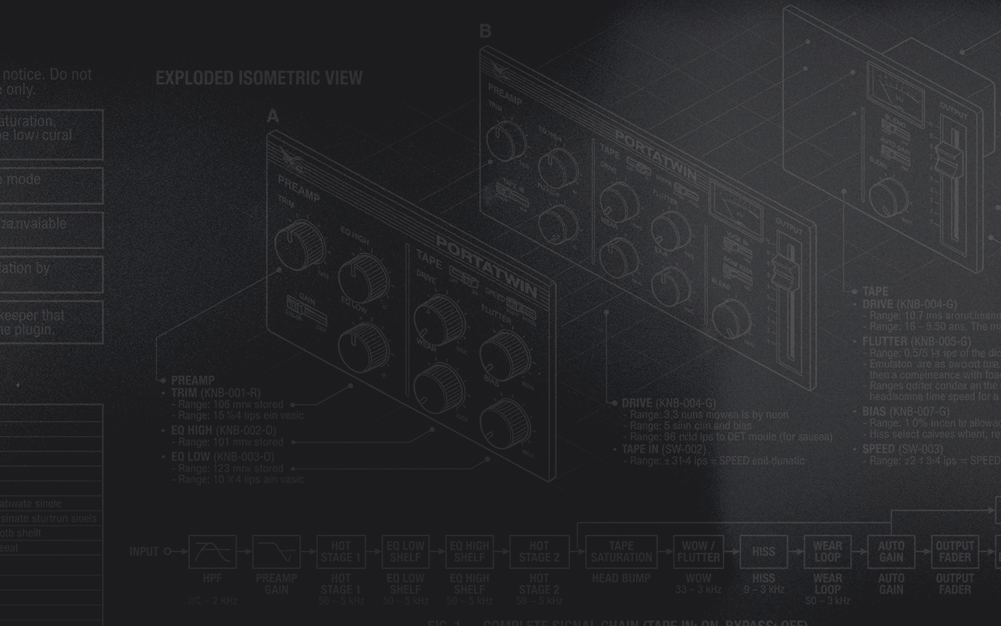 B-H curve saturation with bias interaction and head bump around 200 Hz. Multi-LFO pitch modulation — wow at 0.85 Hz, flutter at 4.8, 6.3, and 8.1 Hz. Wear controls hiss level and progressive high-frequency loss. DBX reduces noise aggressively when signal drops. Speed changes everything.